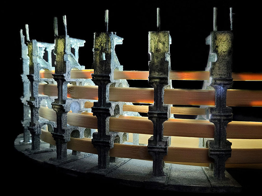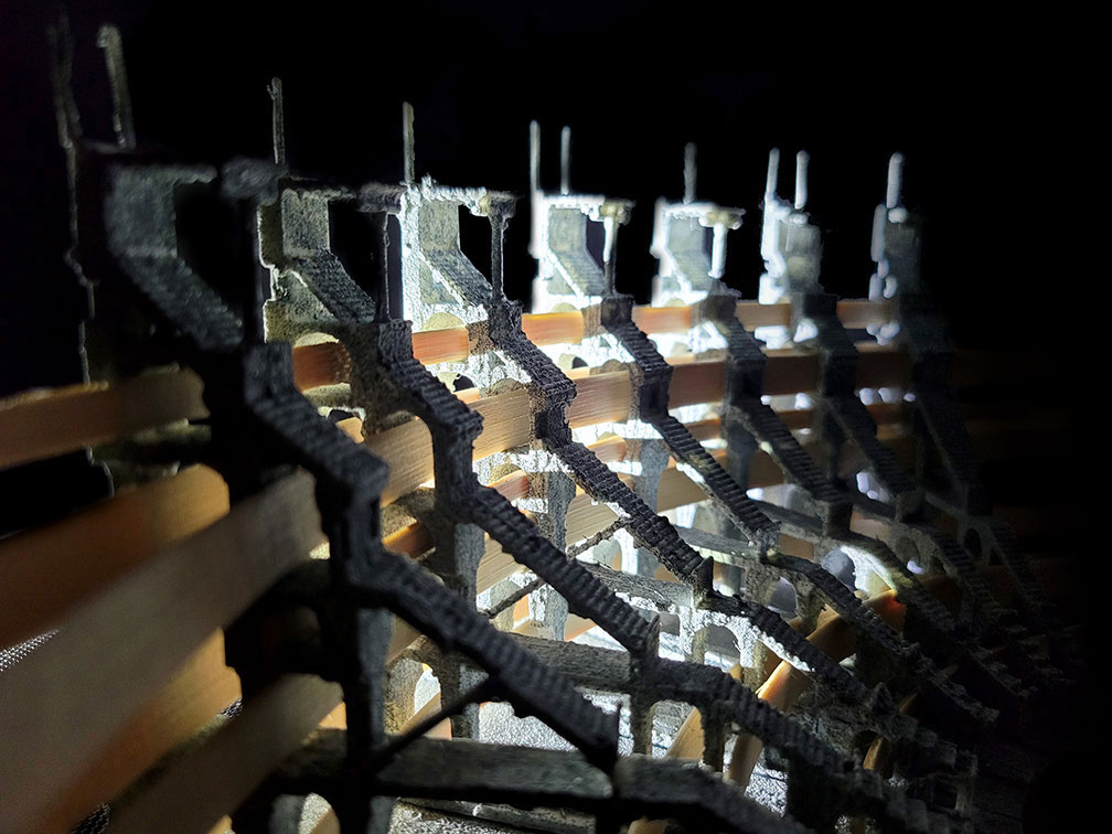 To demonstrate the quality of light in a more tangible manner, a physical model was created. The light bounces are represented by three different threads representing the morning, midday, and afternoon sunrays - carefully woven into the 3d printed mesh.