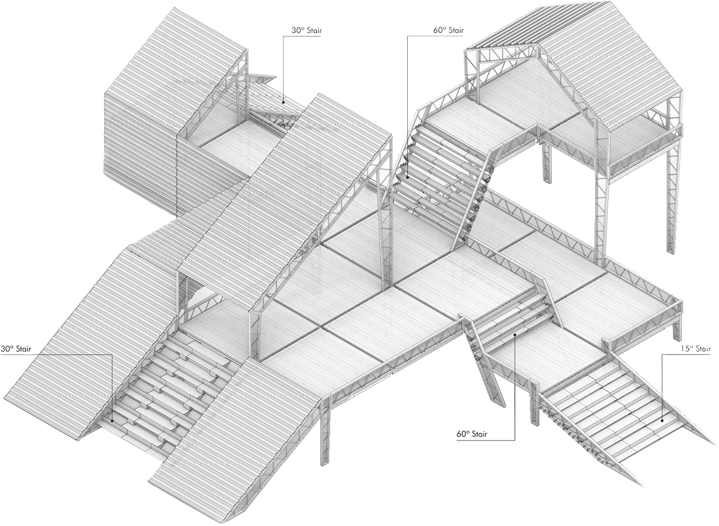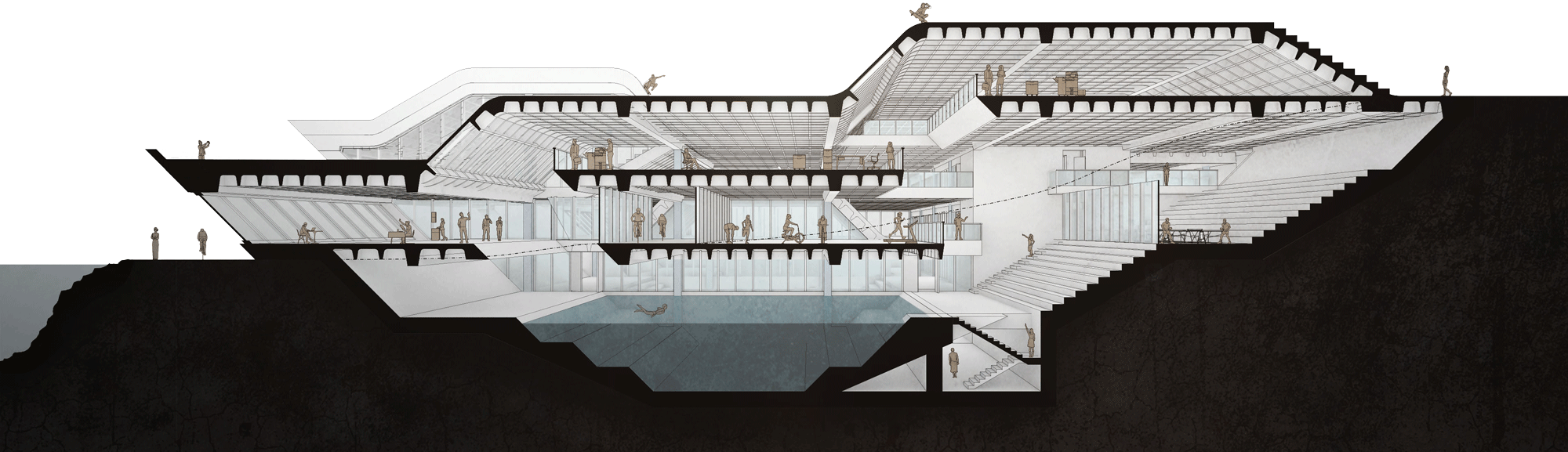 It first starts by connecting to the existing waterfront bike lane and by transforming the roof of the boat house into a publicly accessible velodrome.