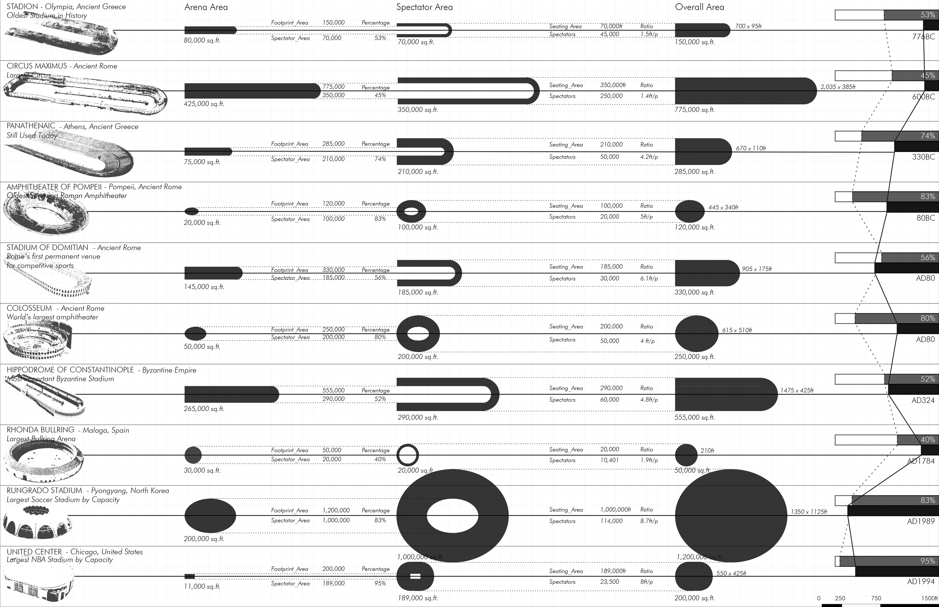 The focus here was on the relation between the sports’ arena and the spectator’s seating. Respective areas and ratios to one another were compared in this table.